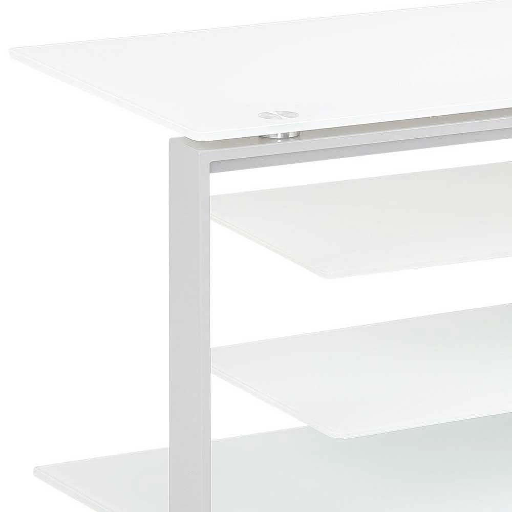 - Glasoberflächen in Weiß lackiert, Rahmen und Rückwand aus grau pulverbeschichtetem Metall