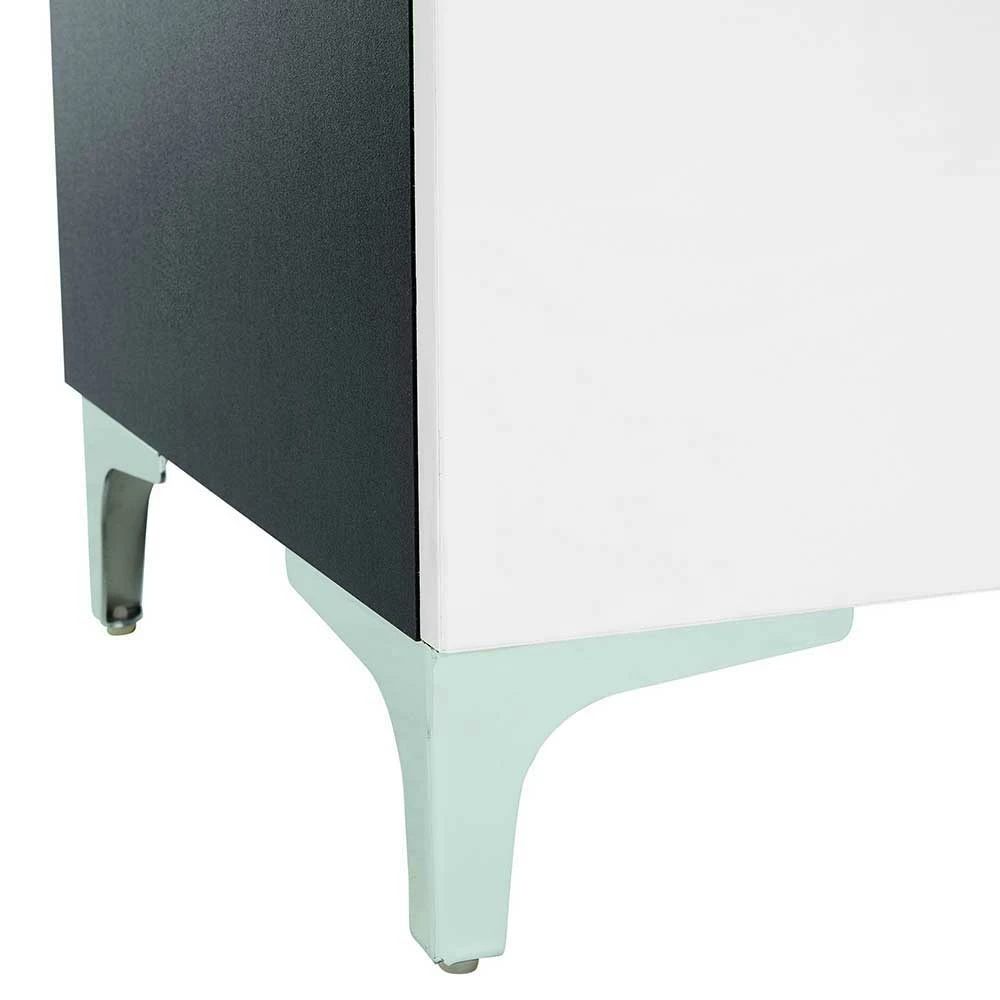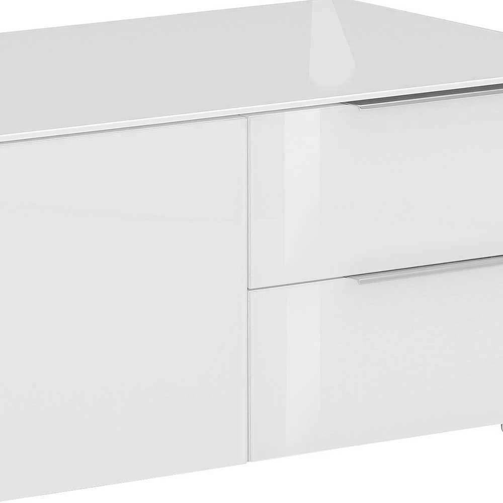 - Oberflächen kratzfest melaminbeschichtet in Schwarz matt, Front mit Glas in Weiß beschichtet, Deckplatte aus 0,6 cm starkem Einscheibensicherheitsglas