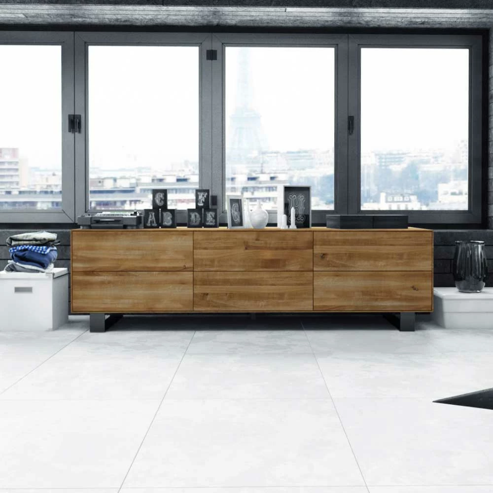 - Hergestellt aus Wildeiche Massivholz (durchgehende Lamellen) und Stahl, Rückwand aus Spanplatte