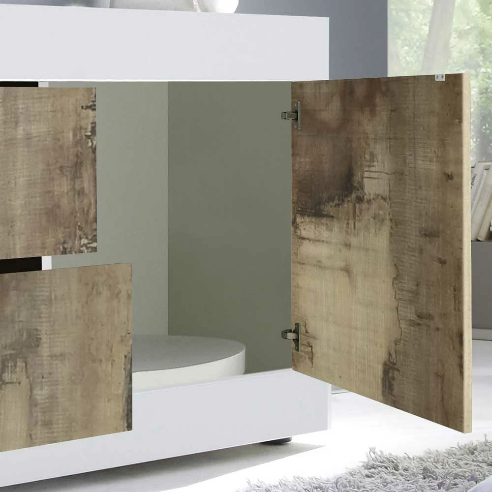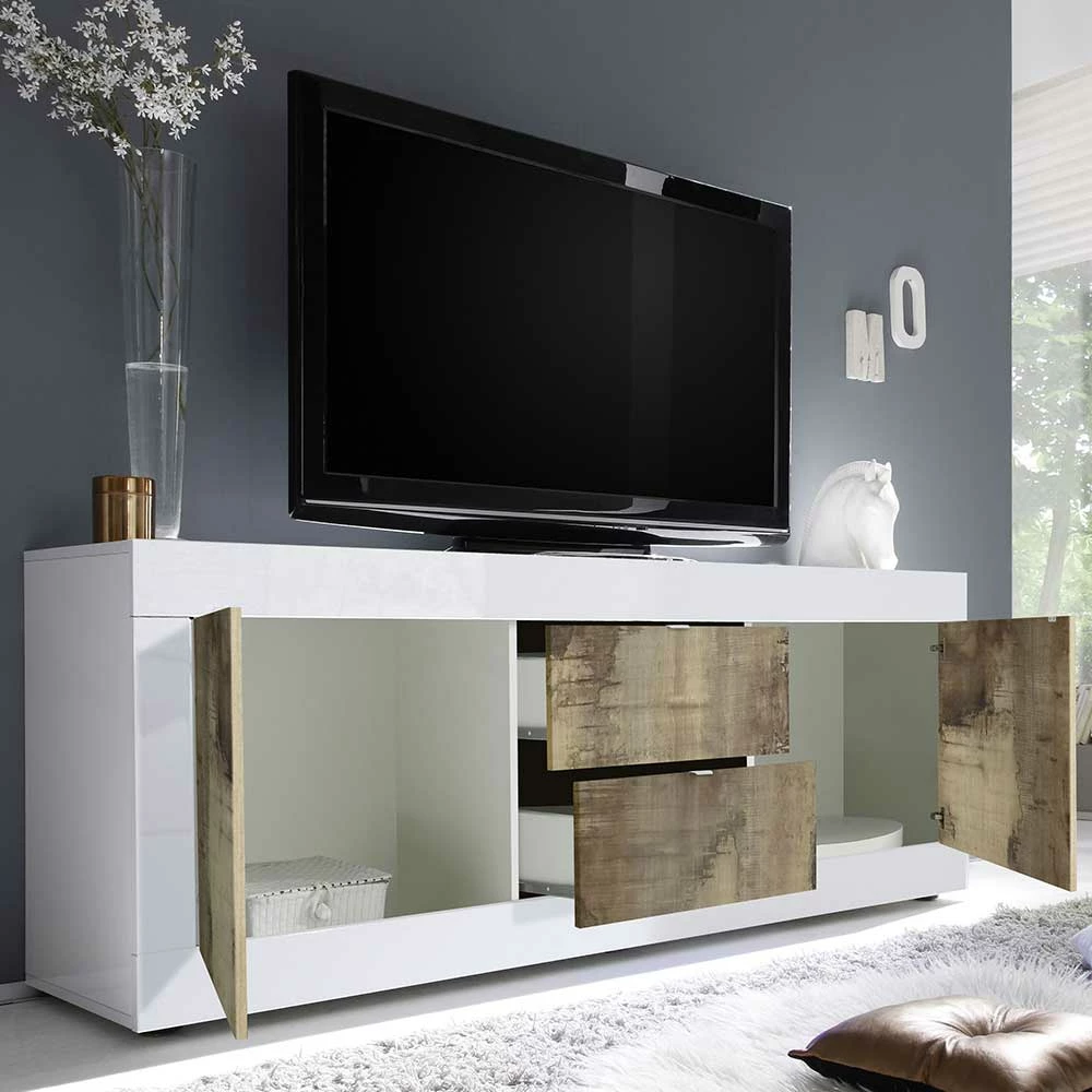 - Attraktives TV Lowboard in Weiß und Altholz Optik