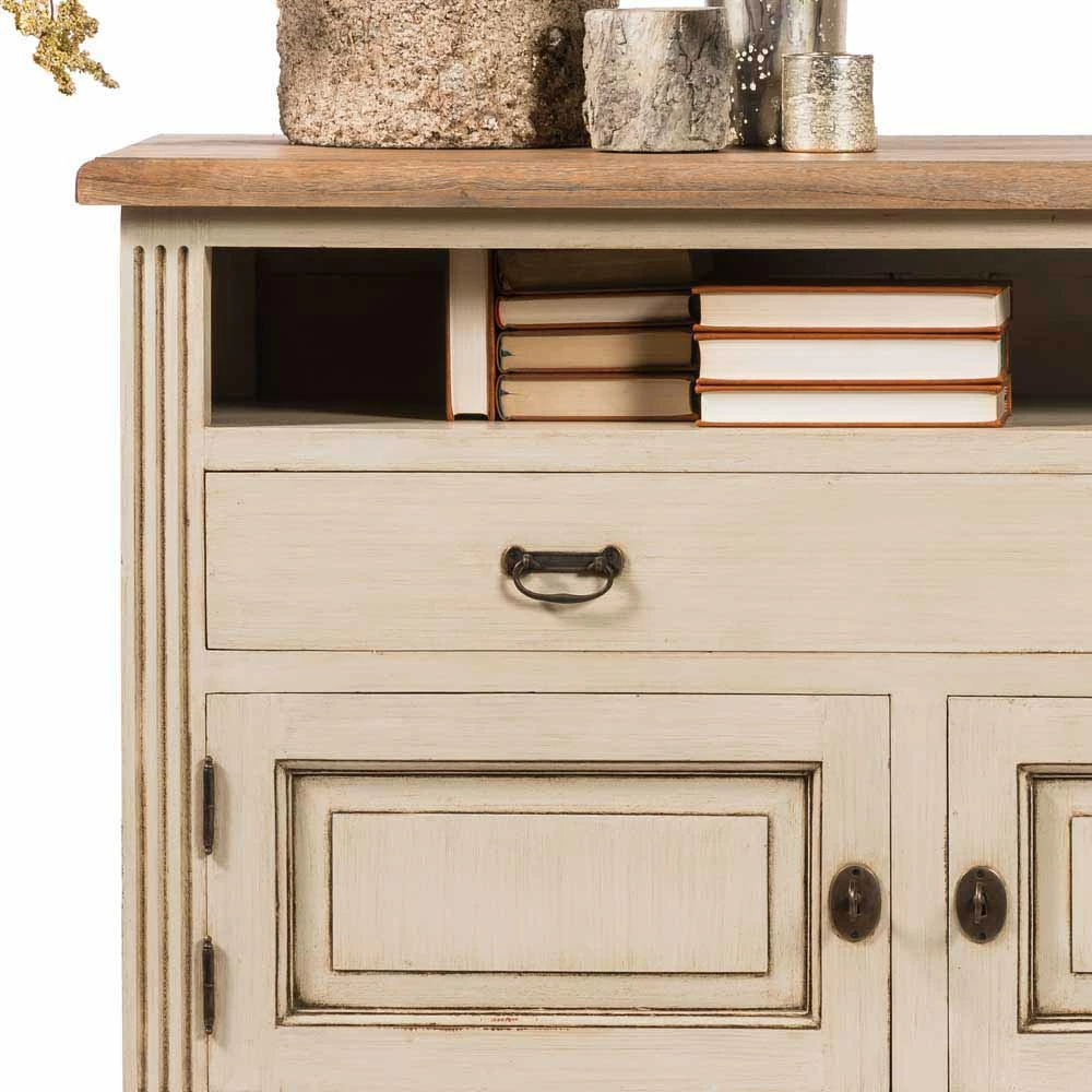 - Oberfläche in Cremeweiß lackiert und mit Antikfinish verschönert, Topplatte mit Teakholz furniert